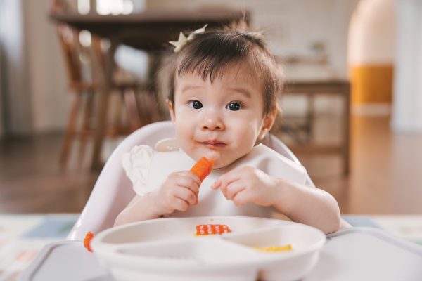 Bé ăn dặm có thể bổ sung thực phẩm chứa nhiều nước như bí đỏ, cà rốt, lê, cam.