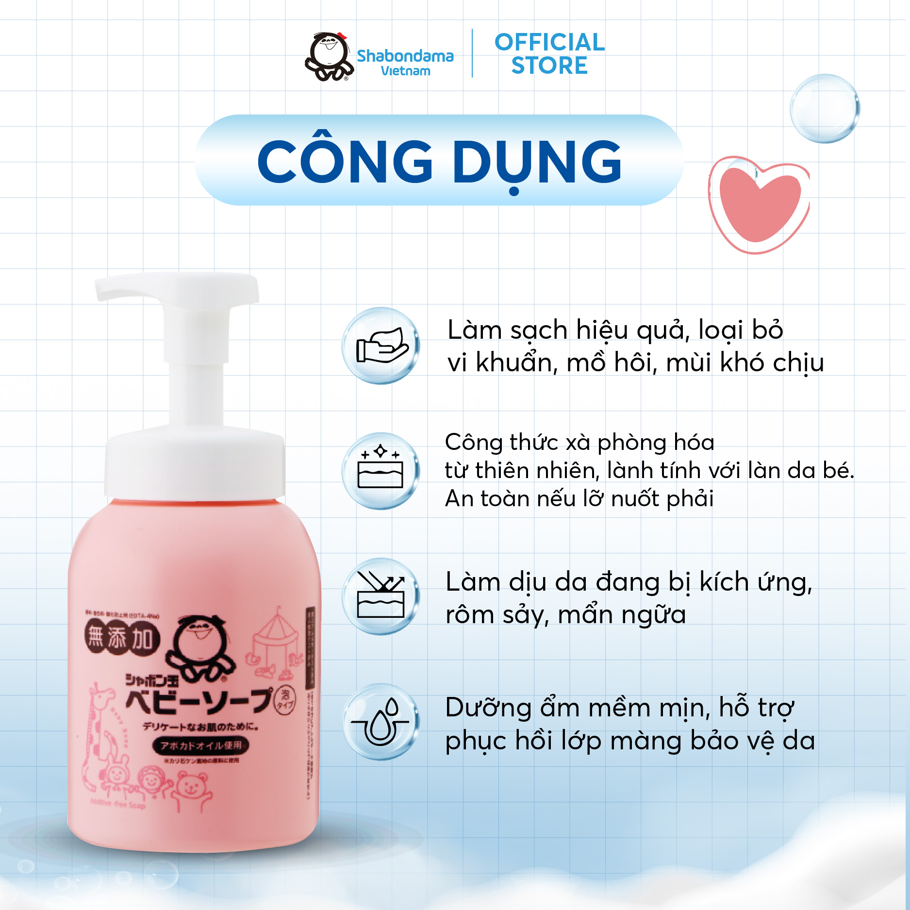 Shabondama sử dụng tinh chất dầu bơ để duy trì độ ẩm lý tưởng, giúp làn da bé luôn mịn màng. Bên cạnh đó, xà phòng từ dầu hạt cọ – một thành phần tự nhiên có tác dụng kháng khuẩn – hỗ trợ phòng ngừa mẩn ngứa, rôm sảy và các vấn đề da thường gặp ở trẻ nhỏ. Sản phẩm không chứa hương liệu, giữ lại mùi thơm sữa tự nhiên của bé, đồng thời được sản xuất bằng phương pháp xà phòng hóa truyền thống, không thêm phụ gia. Đặc biệt an toàn với trẻ em, da nhạy cảm và thậm chí không gây hại nếu bé vô tình nuốt phải.